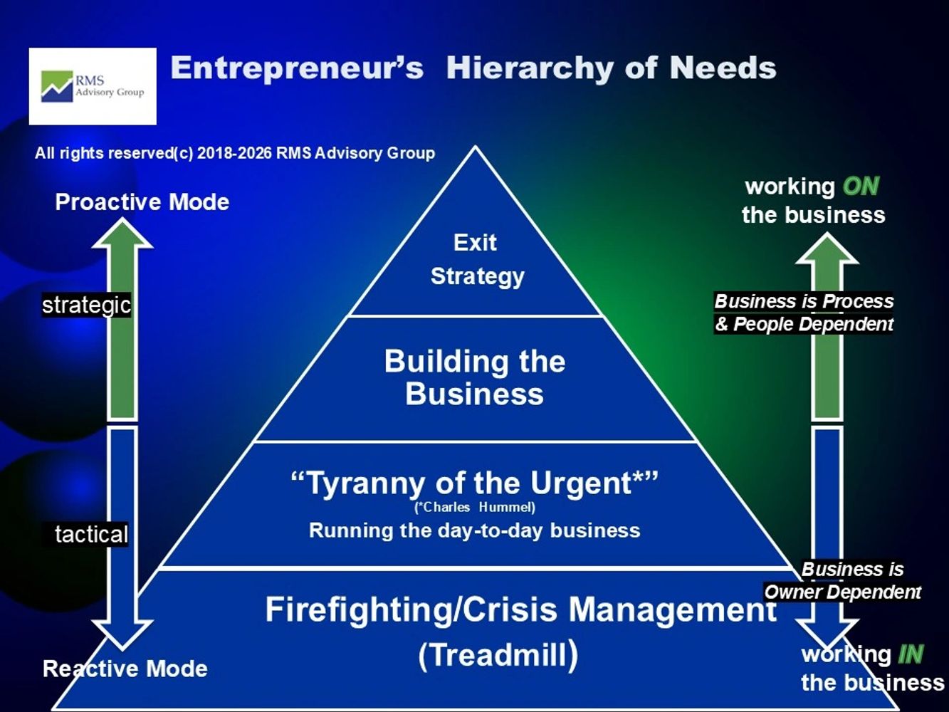 You are not alone if you are encountering some or many of the issues above. In fact, we have found that most small businesses stay stuck in the bottom part of the pyramid shown above, which is a very frustrating place to be. We work with business owners to climb the pyramid and develop a more strategic approach to work on building their business.